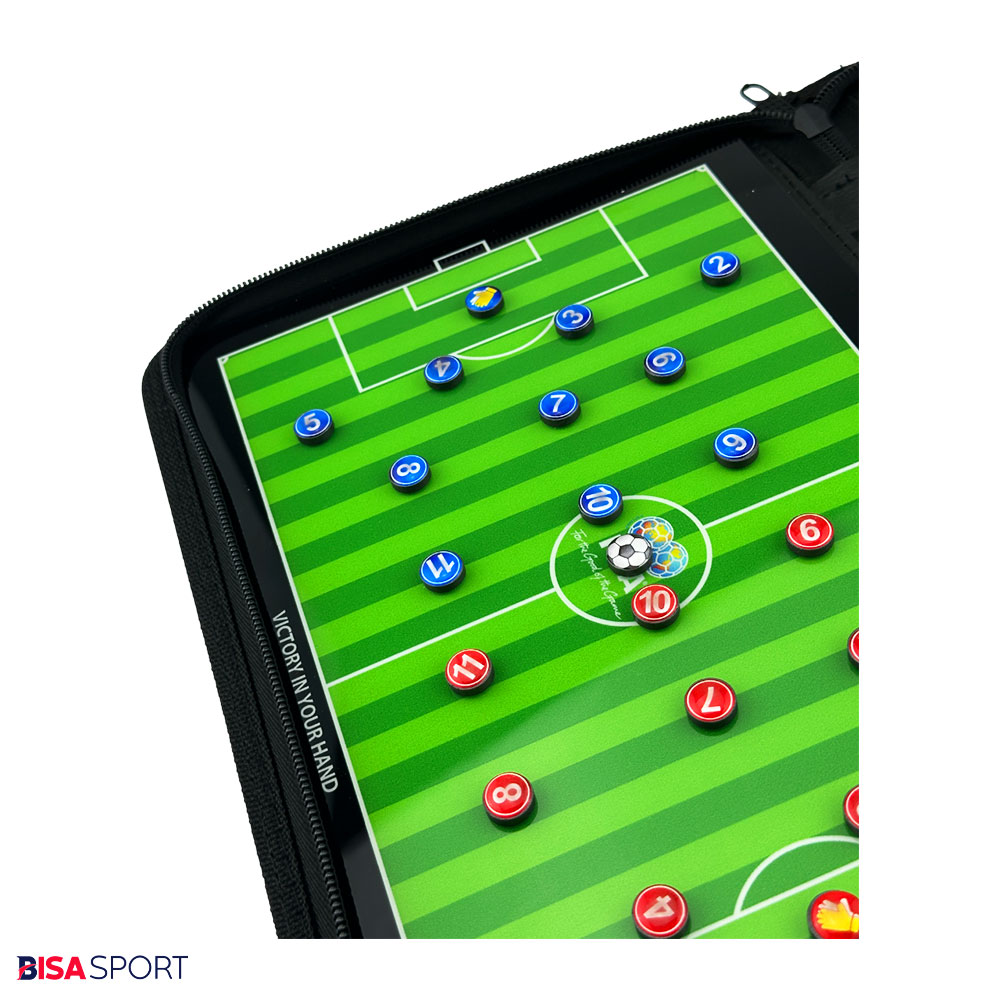 تخته کوچ فوتبال مدل ATA SPORT مغناطیسی بسیار کاربردی، جمع و جور و خوش دست برای مربیان است. این تخته کوچ کیفی در ابعاد 32*22 سانتی متر جزو یکی از پرفروش ترین تخته های مربیگری است. شما با خرید این محصول صاحب یک کیف جمع و جور می شوید که در آن تخته ای با رسم شکل مناسب زمین بازی وجود دارد همچنین 22 عدد مهره مغناطیسی در دو رنگ آبی و قرمز به عنوان بازیکنان از شماره 1 تا 11 و 1 عدد مهره توپ وجود دارد. درضمن ماژیک مشکی که پاک کن دارد برای ترسیمات روی تخته طراحی شده است. جنس کیف این تخته کوچ از چرم مصنوعی بسیار مرغوب بوده و ضد آب است. همچنین یک دفترچه خط کشی شده 12 برگ جهت ترسیم تاکتیک و نوت برداری در این کیف تعبیه شده است.